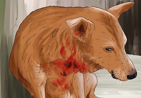 Discern whether the dog is injured. A dog that is injured may react aggressively to someone they don’t know. If you can see that the dog is injured, consider contacting a local shelter or animal control to help you deal with the situation properly. It may not be immediately obvious that the dog is injured if you can’t see blood or a broken limb. However, there are less obvious signs of injury. For example; the dog may lick an area that is hurting intensely, he might pant even though he is sitting still and it isn’t hot, or he may squint his eyes. If you have a relationship with a local veterinary office, you might also be able to contact them for help with the situation.