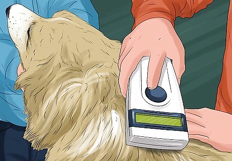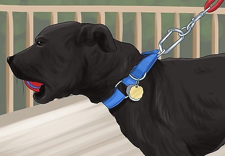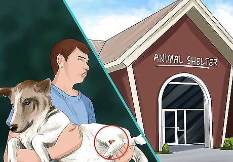 Check for any identifying information. Look to see if the dog has a tag on their collar that contains the owner’s contact information. If they do, then all you need to do is contact them, and have them come get the dog. If they don’t, look for a tattoo that will usually be located inside the dog’s ear or inside of one of the legs. If you don’t find tags or a tattoo, then you can have the dog checked for a microchip at the vets or at the shelter. This microchip will contain the owner’s contact information.