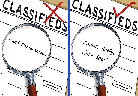 Leave out some important identifying information. Whenever you try to find the dog’s owner using social media, signs, or classified ads, it is important that you leave out one small bit of identifying information. This is because some dishonest people try to claim a pet that is not theirs as their own. For example, don’t post a picture of the dog anywhere. Instead, describe the dog so that the owner would suspect it was their dog, but would have to describe the breed of the dog or offer more specific information about the dog. If you find a small white pomeranian, don’t write “Found Pomeranian,” instead write, “Small, fluffy, white dog.” If you want to post a picture, try to find something unique about the dog that only the owner would know. For example, if they are wearing a collar, take it off for the photo and then ask anyone who comes forward to tell you what kind of collar they were wearing.