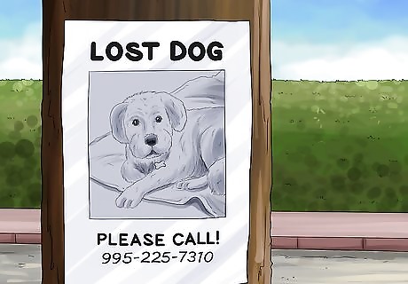 Make smaller flyers to distribute around town. You can take a black and white picture of the animal so that the owner will have to describe the color, include your contact information (or the shelter’s information), as well as information about when and where the dog was found. Distribute these flyers all around town. Be sure to take one or two to each local shelter, hang them on telephone poles, and on community boards. Also take copies to vet offices and pet supply stores as these places almost always offer to post these flyers in their offices and stores. Consider laminating these pages before hanging them. If you will post signs outdoors and live in an area where it rains a lot, a piece of paper with an ink picture may not last after the first rain. The ink will run all over the page and no one will be able to read it. If you can’t laminate the pages, consider sticking each sign in a sheet protector and then hanging them so that the opening is towards the bottom. This will keep rain from getting inside the sheet protector.