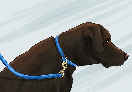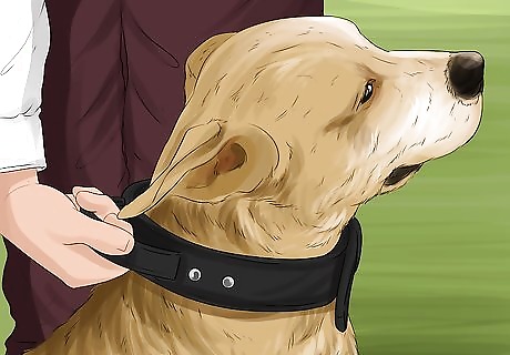 Secure the dog with a leash. If you are able to catch the dog, you should use a leash with a collar or a harness to keep control of the dog. In an emergency, you can use a belt as a slip lead, but this should not be considered a long-term solution. Try not to be rough with the dog. When you catch the dog, keep talking to the dog calmly, pet them gently, and help them understand that you are just trying to help. Avoid making quick aggressive movements that might frighten the dog.