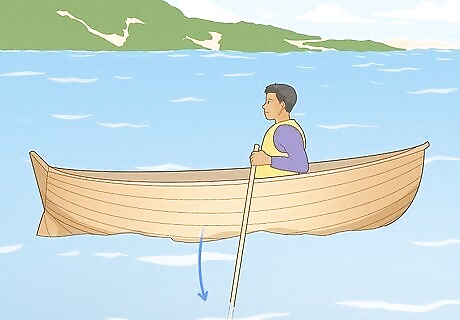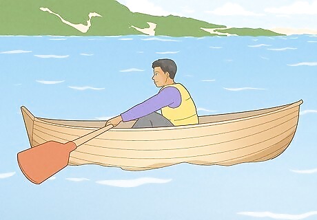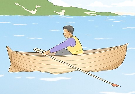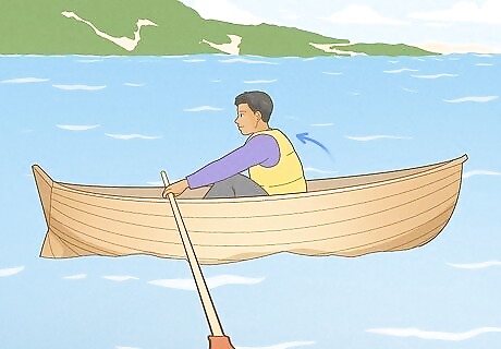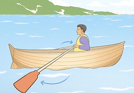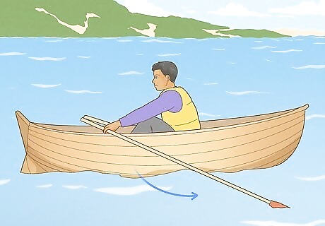 Use one oar to turn the boat. If you are looking to turn your boat in a different direction, simply use one oar instead of two oars. If you want to turn your boat to the left, for example, you would use the left oar, and use your strength to pull just that oar. This will cause your boat to turn to the left. If you want to turn on a smaller radius, hold water with one oar and row with the opposite oar. For example, if you are turning your boat to the right, place your left oar in the water and hold water, and row with your right oar. For an even smaller radius, take a normal stroke with one oar and a back stroke with the other oar. To turn left, do a normal row with your left oar, but then do a backwards row with your right oar. Essentially in a backwards row, you will be bringing one oar through the water and towards the bow of the boat versus a normal row where you move the oars through the water towards the stern of the boat.