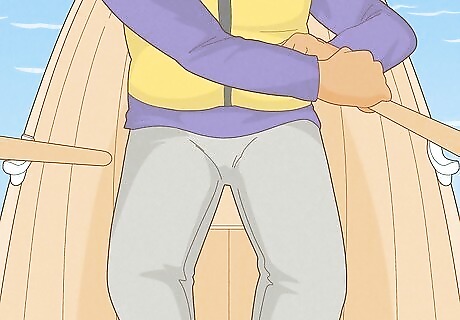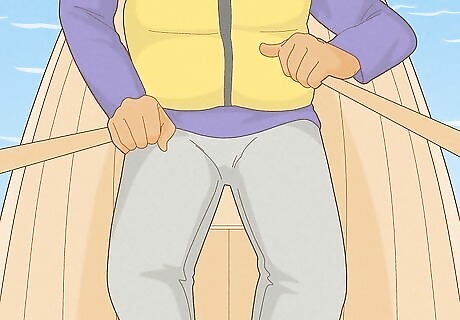 Grasp one oar in each hand with an overhand grip. Your hand should be at the end of the oar, with your thumb on the tip of the oar. A typical rowboat has two oars, and the oars should be about twice the length of the beam of the boat, which is the width of the boat. For a beginner, it's best to use oars that don't overlap when you are in the catch phase.