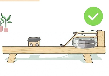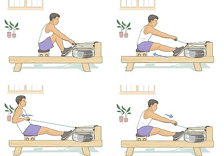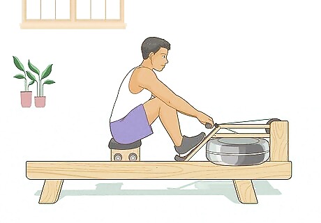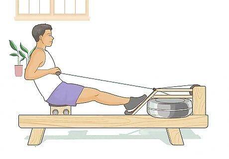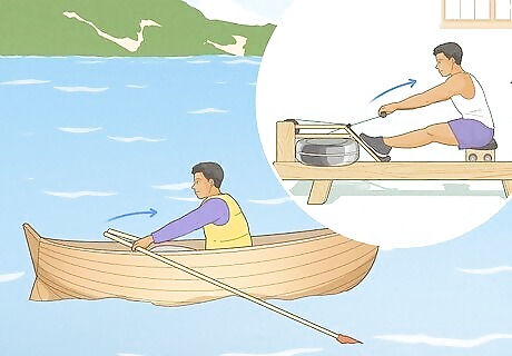 Practice on a rowing machine. The best way to prepare you to row on a boat in the water is by building your body strength on a water rower machine. This machine will target all the areas on your body that you will be using when in an actual boat: your legs, core, and upper body. You can purchase one of these machines for home use, or you can find them in many gyms or work out facilities.