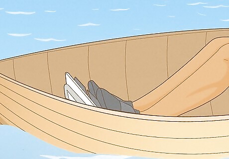 Sit down backwards in the middle of the boat. If you aren't sure where to sit, look for where the oarlocks are located. These are the small rings through which the oars are placed. Because the action of rowing is backwards, that is, the force of rowing propels you backwards, you should sit with your back to the bow (the front of the boat) and face the stern (the rear of the boat). If they aren't in place already, run the oars through the oar hooks so that the blade is in the water and the handle is in the boat. Make sure the oarlock points towards the back of the boat. If your oarlock faces the bow of the boat, it will be more difficult to row because the pitch of your blade will be off. Make sure the boat you are using to row in is an actual rowboat. If you row in a boat not designed for rowing, the task of rowing is going to be much more difficult. An ideal rowboat is 12 to 17 feet in length.