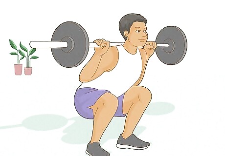 Target your lower body. Your lower body is important when it comes to rowing because 60 percent of the strength you use to row should come from your legs. There are many exercises you can do to improve lower body strength, but a few to start with are: Bridge: Lie on your back with you knees bent and feet flat against the floor, hip width apart. Then, slowly lift up your butt, using your glutes, until you have a straight line going from your shoulders to your knees. Hold the position for one to two minutes, or lower your butt and raise it again at a quick pace without letting your butt touch the ground. To make this position even harder, you can extend one leg straight out, keeping it in the air as you raise your butt. Barbell squat: Stand with your feet shoulder width apart and place a barbell behind your head across your shoulders and grip it with your hands. Squat like you are about to sit down, keeping your upper body straight and your chest out. Go as low as you can and then, stand back up and repeat. Do three sets of 12 reps. Barbell/dumbbell lunges: Start by standing up with your feet together. Position the barbell as you did before, or hold a dumbbell in each hand. Then, take a step forward, bending your front knee so it creates a right angle, and lowering your back knee so that it almost touches the ground. Then, bring your back foot next to your front foot and repeat on the other side. You can do these in place, or you can do them walking. Try to do 50 yards of walking lunges.