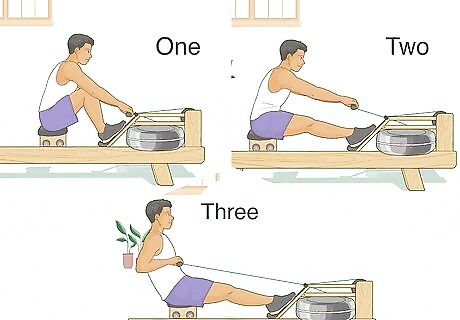 Know the different phases. Rowing on a machine consists of several different positions and phases. It's important to know these positions so that you can achieve the right movement on your machine. These movements can then be applied to competitive rowing in the water. You start at the catch position, and then you move to the release position through the drive phase. The drive phase is when you are pulling the handle towards your body and extending your legs. The release position is the position at the end of the drive phase -- your legs are straight in front of you, your body is sitting upright, and your arms are pulled in towards you. Then, you will move on to the rock over phase, to the recovery phase, and finally back to your catch position. The rock over phase is when you begin to release your arms from the release position, allowing them to go straight, but keeping your legs straight. Then, in the recovery phase, as your upper body bends forward and your arms are fully straightened, you will begin to bend your knees until you've reached the catch position.