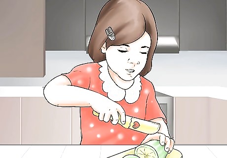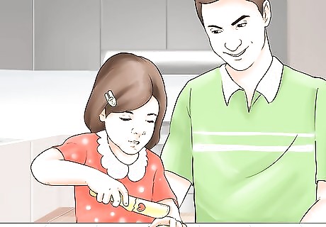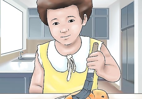 Let your toddler cut soft foods. Teach your child how to use a butter knife or plastic knife by showing them how to hold it, which side to slice with, and how to hold the food being sliced. Then, allow your toddler to help you cut and slice soft foods. For example, you can let them cut bananas, strawberries, soft cheese, and soft vegetables. You can purchase kid-friendly plastic knives that are appropriate for toddlers when supervised by an adult. Teach your child the dangers of sharp knives and to only use the kid-friendly ones. Tell them they shouldn't touch knives without adults present.
