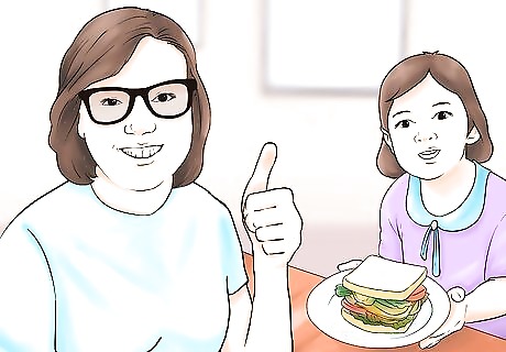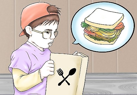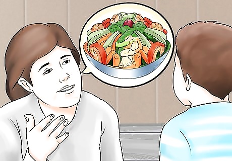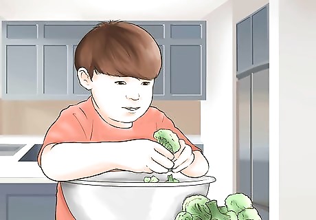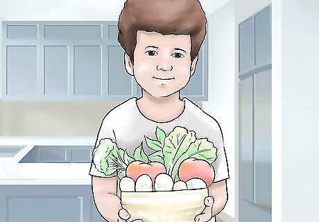 Let them choose the menu. One good way to foster interest in healthy eating habits and cooking is to get your child involved in the menu planning stage. Choose a variety of different ingredients and place them on the counter. Let your child choose which foods you will make that day. This helps gives them a sense of independence and helps them be interested in the food. For example, you may set out multiple types of bread, three different kinds of fruit, five different vegetables, and different spreads. Let them choose one or two items from each category to make snacks or sandwiches for lunch.