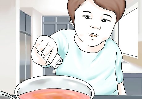 Let them sprinkle seasonings. If you don’t think your child is old enough to help with the actual food preparation yet, you can let them do small things, like sprinkle seasonings. Show them how to pick up a few herbs and place it in the dish or gently sprinkle salt and pepper. Measure out how much seasoning should go on the dish if you don’t want too much. If it doesn’t matter, like if you’re adding basil or cilantro to a dish, you can let your toddler pick up some with their fingers and put it on the food.