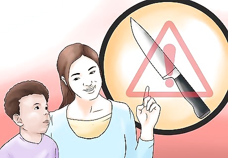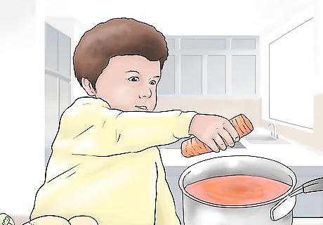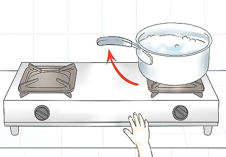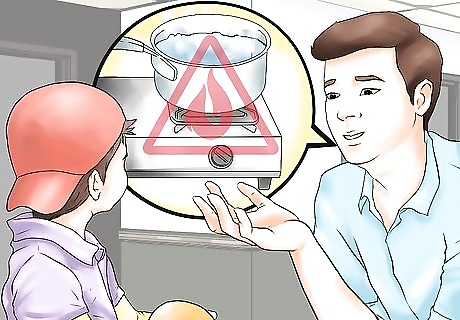 Prevent scalding accidents. Since your toddler is helping you cook, they may be around hot stoves or pans full of hot food. This presents a danger to your child. To help prevent your child from getting hurt, you should take extra precautions with hot items to ensure your child’s safety. For example, don’t place hot bowls or pans near the edges of counters or in places where your child can reach. Consider using the back burners of the stove so your child won’t accidentally touch them. Move handles of pots and pans towards the back of the stove so your child can’t grab them.