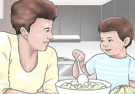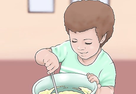 Let your toddler stir. One easy way you can let your kids help you cook is by giving them a spoon. Let them stir things as you prepare a meal. Depending on their age, you can give them small bowls to stir or let them stir an entire bowl. You or your partner can help them stir by holding their hand and teaching them how to mix ingredients. For example, you can let them mix together dry ingredients for a cake, or mix the eggs into the cake mix. You may let them try mixing the seasonings into dips or sauces. You can also try letting your toddler mix things with their fingers. Just make sure they wash their hands first. Place the bowl on a surface where your child can easily get to it. You may want to prepare ingredients at a table where they are sitting in a chair. If they try to mix ingredients at a counter and are too short, they can easily knock the bowl off the edge and cause a mess. Don't let toddlers stir things in hot pans. There is a serious burn risk when children are around hot stoves.