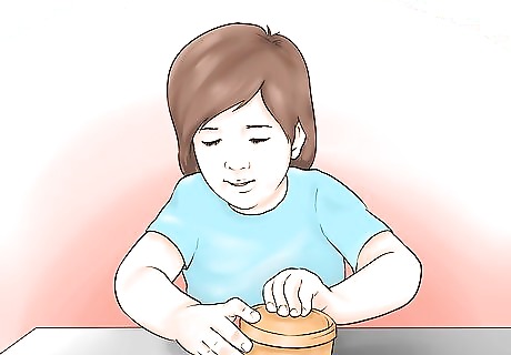 Let them open up containers. You may consider letting your child open up containers, boxes, or bags of ingredients for you as you cook dinner. This may include plastic containers of leftovers, bags of produce, or boxes of mixes. Avoid giving your child anything that could cut them or that needs scissors to open. For example, you may let your toddler pull the top off the leftover chicken, pull the green beans from the produce bag, or open the box of cake mix.