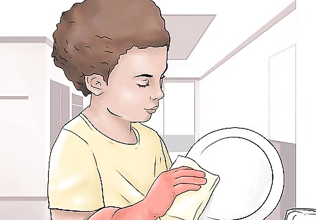 Encourage your toddler to help with cleanup. Another way your toddler can help you cook is to help you with the cleanup. You can let your child put silverware, cups, or bowls into the dishwasher. You can also let your child put away ingredients or hand them a damp rag and let them wipe off a surface. You can also get them to help put trash into the garbage can.