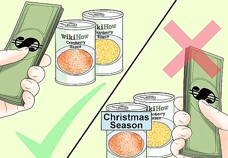 Buy canned foods out of season. Just like fresh foods, canned foods have peak selling seasons. Cranberry sauce, for instance, will cost more around Thanksgiving and Christmas. To save money, avoid buying canned foods that are in-season.