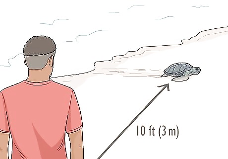 Give sea turtles at least 10 feet (3 m) of space. Don't approach sea turtles when they come up to land. These are most often female sea turtles coming to nest, and they can easily get spooked. If you find yourself close to a sea turtle on the beach, don't make any sudden movements and slowly move away from the turtle. Never pick up a sea turtle egg or hatchling. Typically, there will be signs posted around nesting areas. Pay close attention and stay away from the areas designated by these signs.