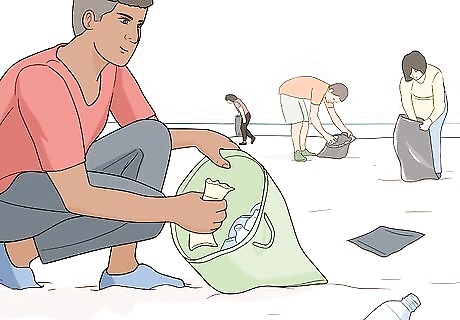 Participate in a beach cleanups. Many coastal areas have teams of volunteers who clean up the beaches. Volunteer some of your time to get rid of litter, trash, and recyclable materials that wash up on beaches and make a safer habitat for sea turtles. If you don't have time to participate in a beach cleanup, at least clean up after yourself. Plastic bags and fishing equipment are particularly dangerous for sea turtles.