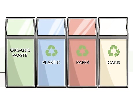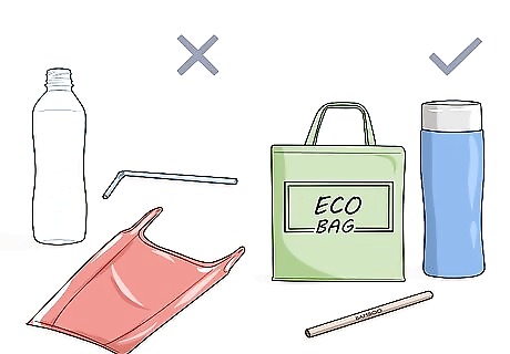 Reduce your consumption of single-use plastics. Single-use plastics include shopping bags, water bottles, straws, coffee cups, produce bags, sandwich bags, and plastic wrap. Sea creatures, including turtles, often mistake plastic as food. This causes around 100 million marine animals to die every year. Carry reusable shopping bags with you. If you always have a reusable shopping bag with you, it's a lot easier to say no to plastic bags. There are lots of reusable tote bags that fold down into small to fit into your pocket or purse. Drink from a reusable water bottle. Look for places you can refill your water bottle throughout the day. Often, cafes will refill your water bottle for free. You can also invest in a reusable coffee cup if you frequently order coffee or tea out. Disposable coffee cups are often lined with plastic, so they can't be recycled.