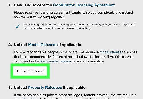 Upload model release forms (if applicable). If the image has people in it, each person in the photo needs to fill out a model release form for the photo to be eligible for licensing. To download a blank model release form, tap the blue text that says "blank model release" in the text of section number 2 in the Licensing Submission form. To upload model releases, tap the button that says "Upload release" below section number 2 to upload completed forms.