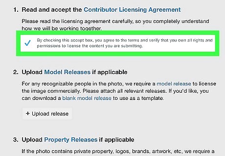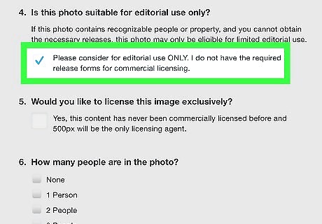 Tap the checkbox if the photo is only for editorial use. If you do not have a model or property release form for a photo, you can still upload it. It will only be considered for editorial use. Tap the checkbox below section number 4 of the Licensing Submission Form if you do not have a model or property release form for a photo.