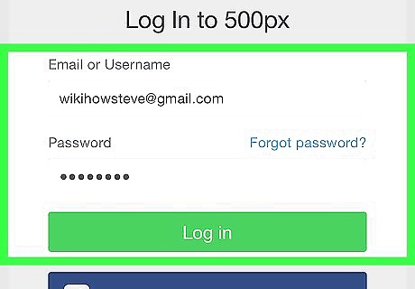 Type your email and password and tap Log In. Type the email address or username associated with your 500px account in the first bar on the login page. Type your password in the second bar. Tap the green button that says "Log in" when you are finished. You can also tap Continue with Facebook or Continue with Google to log in with your Facebook or Google account. You may need to type your Facebook or Google password to log in.