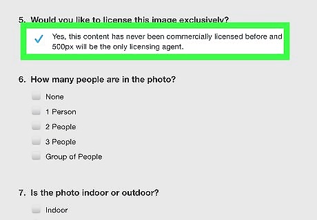 Tap the checkbox to license the image exclusively. If you license a photo exclusively, you will only be able to license it to one user. However, you will get paid more to license a photo exclusively. To license a photo exclusively, tap the checkbox below section number 5 of the Licensing Submission Form.