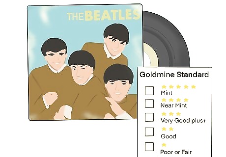 Grade the condition of your record by the Goldmine Standard. Vinyl record collectors have a standard way of rating their records for selling online, called the Goldmine Standard. This way the customer knows exactly what they’re getting and how much they should be willing to pay. Once you’ve checked the condition of your record, grade it to the standard so you can sell it fairly. The levels are: Mint: never been opened. Near Mint: not at all warped or scuffed. Very good plus (VG+) or Excellent (E): a few light scratches. Good (G): scratches or grooves that impede the sound quality. Poor (P) or Fair (F): not really acceptable in terms of appearance or listening quality.