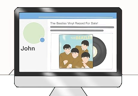 Post your records on a record-selling Facebook group. Include details about the name and condition of your record, and a photo. Post a prospective price and say you’re willing to negotiate. If you live in a major city, there’s probably a Facebook group for people who want to buy and sell vinyl records in your area, and they can pick the records up from you in person. If you don’t live in a major city, you can still find a Facebook group of buyers and sellers in your general area, and mail the records to them. Keep in mind that you might be selling to people who know less about music than you, so you might get some push-back if you ask for a high price for a valuable record. An advantage to using a Facebook group is that you don’t have to pay a fee to use it. You have to have a Facebook account to join a Facebook group.