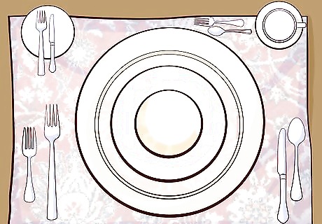 Arrange your plates on the charger plate. Always arrange the plates in order of use. For example, if you were serving a soup, salad, and entrée, you would first place the main entrée plate on the charger. Next, you lay down a salad plate, followed by a soup bowl. Each piece of plates will be cleared away after use. If you’re serving more than three courses, have each plate brought out and then cleared away after the course to save space. Wait to clear the charger plate until it’s time to clear the entrée plate.