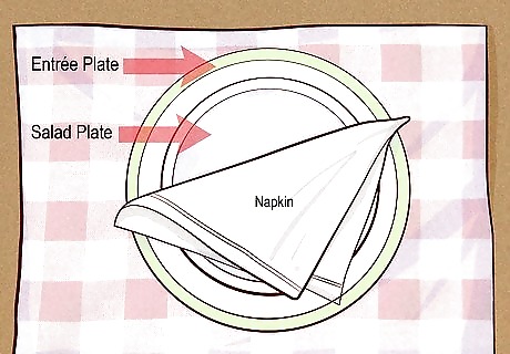 Arrange your plate and napkin. A casual dining experience can include a soup or salad as an appetizer, an entrée, and a dessert. First, place the large main entrée plate on the bottom center of the placemat. Next, place your salad plate or soup bowl on top of the main entrée plate. The napkin can be placed between the entrée plate and the appetizer plate or rolled up on top of the appetizer plate. If you’re serving dinner rolls, place a small appetizer plate to the left of the placemat. The dessert plates should be brought in with the dessert for casual dining experiences.