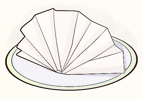Create a napkin fan. Napkin fans add elegance and interest to any table setting. First, fold the napkin in half lengthwise. Next, fold the napkin into small sections like an accordion. Leave about three inches of unfolded napkin at the end. Fold everything in half with the unfolded section in the middle. Tuck the unfolded section into the back of the napkin and unfurl the fan. If you have trouble creating a napkin fan, watch instructional online videos. Some people learn the folding technique more quickly if they can watch it done. Place the folded napkin on top of the table setting.