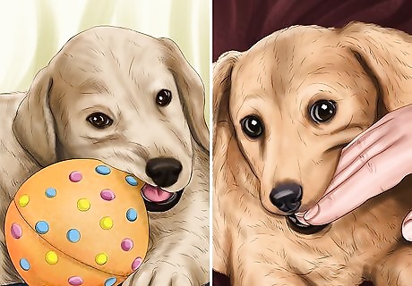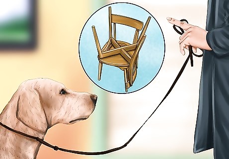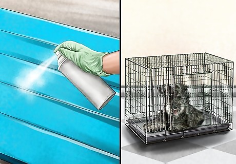 Stop your dog from destructive chewing behavior. It's important that you curb any destructive chewing your dog engages in. For starters, you should make sure all items that might be appealing for your dog to chew on, such as shoes, are in places that are out of your dog's reach. You can also purchase a bad-tasting repellent or spray at the pet store to use on furniture or other items. These specially formulated sprays are not toxic to dogs but the taste will deter your pet from chewing. When you leave the house, either crate your dog or make sure they have a chew toy to gnaw on during your absence.