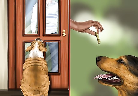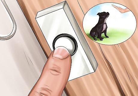 Make your dog sit when the doorbell rings. Some dogs have a bad habit of rushing to the door when a visitor knocks or rings the bell, and many will jump on your guests once the door is open. Teach your dog to sit and stay when they hear the sound of a doorbell or knock. This will help your dog learn that guests are only to be greeted after the successful execution of a command and permission from you. When the doorbell rings, make your dog sit. Do not open the door until your dog is sitting.