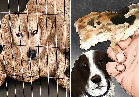 Don’t allow your dog to beg. Dogs are great at begging, using their adorable faces and sad eyes to convince you that getting on the bed or nabbing a bite of your pizza is a great idea. It is important that your dog understands that begging will not be rewarded. If your dog begs for food, try establishing a place away from the table where they are required to be during meals. At mealtimes, make your dog go to a designated area such as their crate or bed. Try rewarding your dog with a dog treat at the end of meals if they remain in their established space.