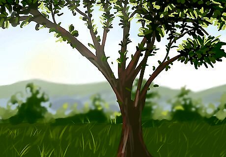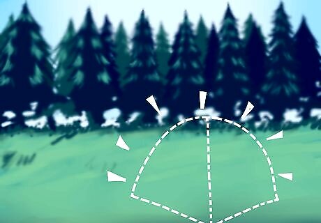 Find a break from sun and shade. Ideally, a tent should be placed so that it will remain in shade throughout the following morning, especially if it’s hot out. And even though a dome tent is wind resistant, it’s also a good idea to find as much of a wind break as possible, in case the weather should pick up while you're out hiking or away from the tent. The last thing you'd want is to come back to an empty camp site! Placing a tent to the west of a hillside or a treeline would be the best way of giving yourself the most comfortable night inside and a cool morning to follow. Never camp under trees. If it's raining, or threatening rain, it can be tempting to think that setting up under some tree cover would be a safe alternative. Unfortunately, this risks lightning and other hazards. A tent won't stop a falling branch, should something happen. Set up well-clear of such hazards.