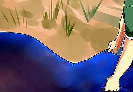 Stake the tent to the ground. There should be little vinyl hoops or eyelets at each corner and in the center of each side of the tent, which you should use to stake the tent to the ground. Push the stake through and into the ground to secure the tent. If you're going to be sleeping in the tent immediately, you may choose to not stake it, especially if you're in an area with lots of coverage and low wind. If you're going hiking though, or the wind is up, it's usually important to stake the tent to the ground so it doesn't blow away.