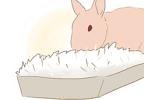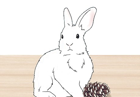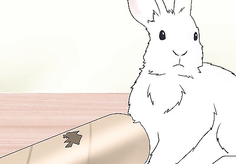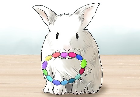 Give your rabbit something to chew on. Rabbits love to chew on things! Chewing not only helps keep your rabbit’s teeth filed down, but can also keep him entertained for long periods of time. Hay, which is a major part of your rabbit’s diet, takes a long time to chew and will thus keep your rabbit occupied for quite a while. You can also put branches from non-chemically treated fruit trees in your rabbit’s cage. Wooden chew sticks are also good, but your rabbit may become quickly bored with the sticks. Make sure to provide him with a variety of items, such as an untreated wicker basket and dried-out pine cones, to chew on.