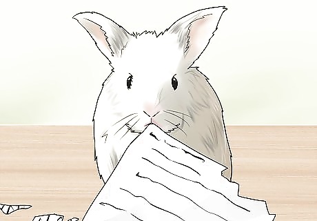Encourage your rabbit to dig. Rabbits like to dig, so providing your rabbit with digging opportunities will make his cage feel more playful. Filling a flowerpot with earth, or filling a cardboard box with shredded newspaper, will foster your rabbit’s natural digging activity. A wicker basket filled with shredded newspapers or old magazines would also encourage your rabbit to dig.