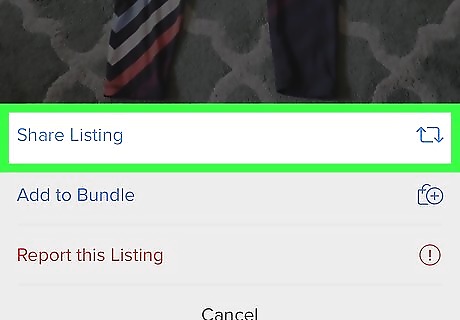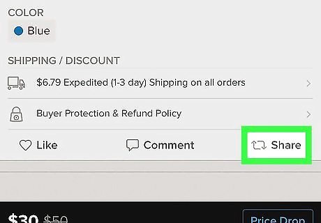 Scroll down to the bottom and tap Share. This button looks like two revolving arrows in the lower-right corner of your listing, below the shipping and discount details. It will open your sharing options.