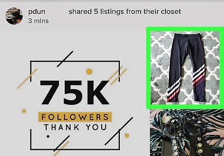 Find and tap the listing you want to share. You can open any item from your Feed page, the Shop page, or another user's profile. This will open the listing details. As a shortcut, you can tap the Share button below a listing on your Feed, or the two revolving arrows icon below an item on a shop page. This will directly take you to the sharing menu.