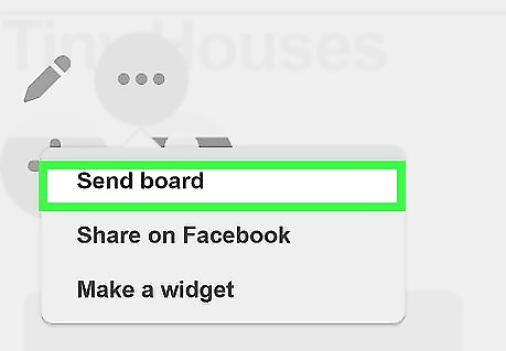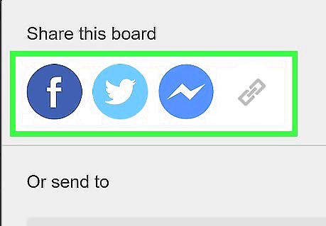 Select a sharing method. There are numerous ways to share your board: Facebook: It's the blue icon with a white “f.” Type a message to accompany the Pinterest link, then click Post on Facebook. Twitter: It's the blue icon with a bird. Type any other text you want to add to your tweet, then click Tweet. Messenger: It's the blue icon with a lightning bolt. This opens a new Facebook message. Add your recipient(s) to the To: field and then click Send. Link: It's the gray chain link. This displays the URL to your board. You can copy and paste it anywhere, including messaging apps and blogs. Name or email: Click a name or address in the list to select a recipient. If you don't see the person you want to share with, type their name or email address into the box, then click it when it appears. Type a message (if desired) and click Send.
