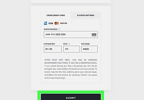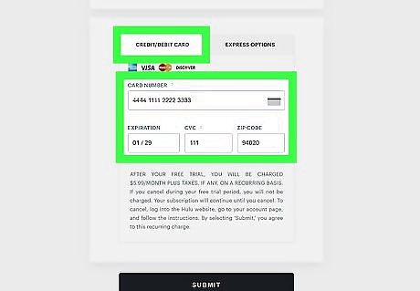 Choose your payment method and enter that information. If you use a credit or debit card, you'll need the card number, security code, and expiration date. If you choose to use PayPal, you have to enter your account information. If you are eligible for a free trial, you will see that you will not be charged to use Hulu during the trial period.