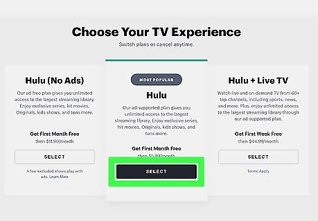 Click to select your plan. If you are a new customer, your first month is free with any of the plans. Hulu for $5.99/mo is the most popular, basic, and ad-supported plan. Hulu (NO ADS) for $11.99/mo lets you watch shows without showing you ads. Hulu + Live TV for $44.99/mo lets you watch live and on-demand TV along with Hulu's basic streaming library.