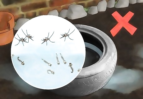 Don't leave pools of standing water near your home. Mosquitoes breed in standing water, so emptying pools and puddles will reduce the mosquito population. Check around your home and yard frequently, and turn over and wash out any containers or other items that might collect rainwater, such as flower pots, kiddie pools, or bird baths. Change the water in your pet's drinking bowl frequently.