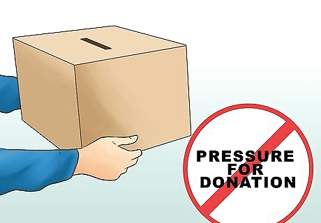 Avoid charities that pressure you for a donation. Most charities will work hard to make their case for a donation. This is how charities continue to sustain themselves. However, if a representative is very pushy or rude, even after you've declined a donation, you're likely dealing with a fraudulent charity. It's normal for a charity representative to politely make the case for a donation. They may calmly repeat the benefits of their charity and ask you to reconsider. A scammer, however, will use more aggressive tactics. They may become somewhat hostile and attempt to guilt trip you into donating, asking questions like, "Don't you care about this cause?" A scammer will not politely restate their case. They will aggressively attempt to coerce you into donating after you've declined or requested more information.