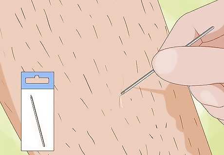 Tease the hair out with a sterilized needle if it’s close to the surface. If you can see the hair right under the surface of your skin or inside a pustule, you may be able to hook a needle under it to free it. Clean a needle in isopropyl alcohol or hold it in a flame for a few minutes to sterilize it. Gently push the tip of the needle under the hair to pull out a small loop, then free the end of the hair by pulling on the loop with a pair of tweezers. If you use a flame to sterilize the needle, allow it to cool down completely before you use it so you don’t burn yourself. Resist the urge to pluck the hair out, since it might simply grow in under the surface again. Instead, try cutting it close to the skin with a pair of clippers. If you can’t hook the hair right away, don’t keep digging around with the needle. This will only irritate the area more, and it could lead to scarring.
