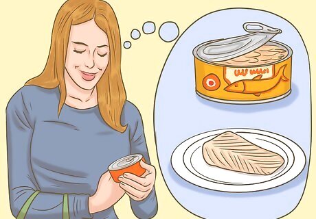 Grab a few fish filets and cans of tuna. Fish and shellfish are also a great source of protein and can help you to create healthy and filling meals on days where you don’t want to eat meat. Any kind of fish is allowed, including canned varieties. Grilled salmon is a great, heart-healthy way to get protein during the diet, and it pairs great with vegetables for a filling dinner.