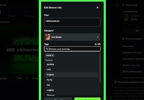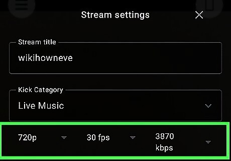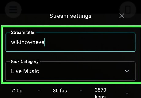 Edit your stream information. This is where you create a title for your stream and select a category. Use the following steps to edit your stream information: Log in at Kick.com. Click your profile icon in the upper-right corner. Click Creator Dashboard. Click Stream in the menu bar to the left. Click Edit below “Stream info” on the right. Enter a title for your stream. Use the menu below “Category” to search and select a category. Use the search bar below “Tags” to select some tags for your stream. Click the toggle switch if your content is for mature 18+ audiences. Click Save.