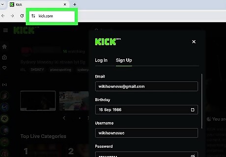 Create an account. In order to stream on Kick, you’ll need to create an account. You can sign up using your Google or Apple ID, or you can use the following steps to do so: Go to kick.com in a web browser. Click Sign Up in the upper-right corner. Enter your email, birthday, username, and password. Alternatively, you can click one of the options to sign up with your Google account or Apple ID. Click Sign Up. Retrieve the confirmation code from your email. Enter the confirmation code. Click Create account. Click Get Started.
