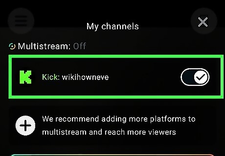 Tap the toggle switch next to Kick. This indicates that you want to go live on your Kick account.